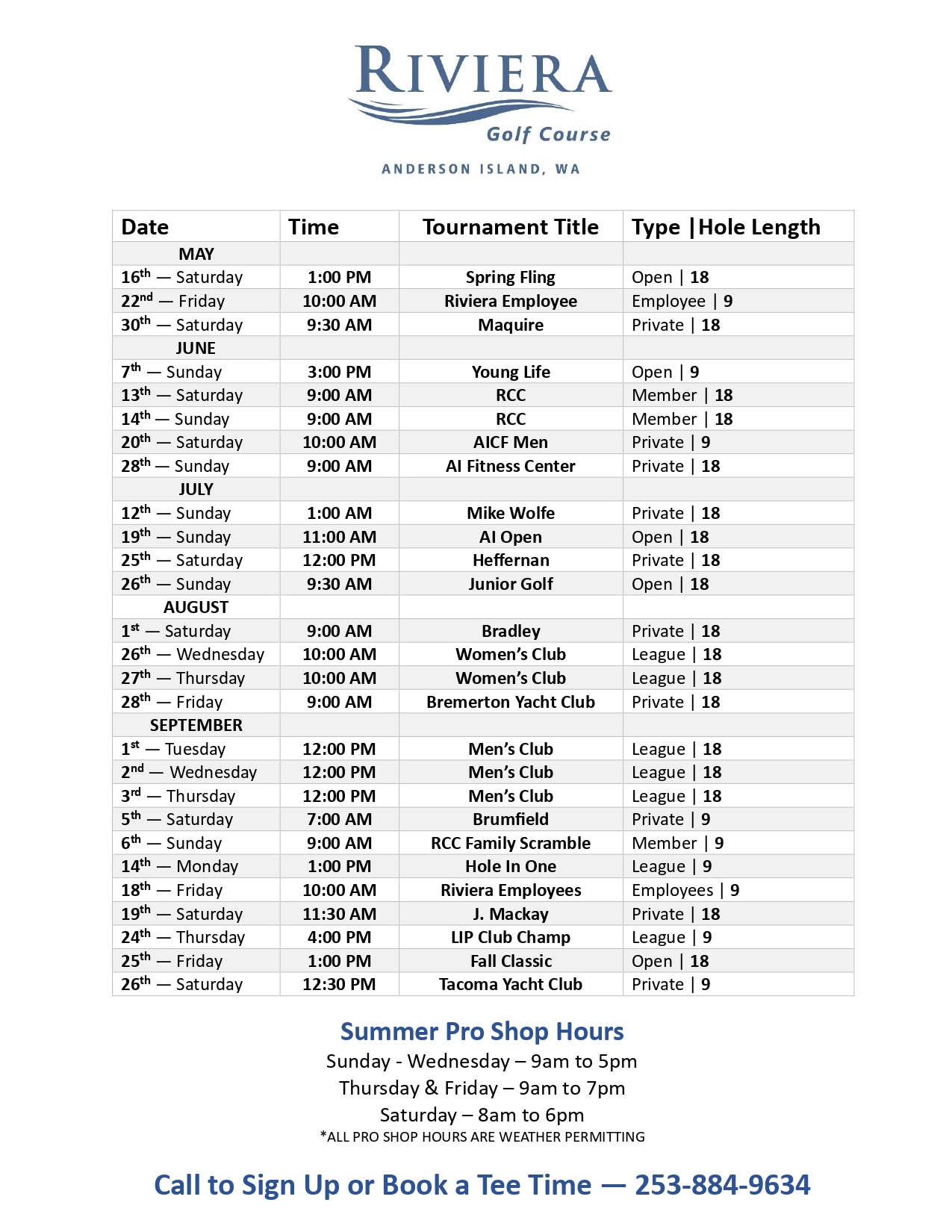 *Pro Shop hours are weather permitting.